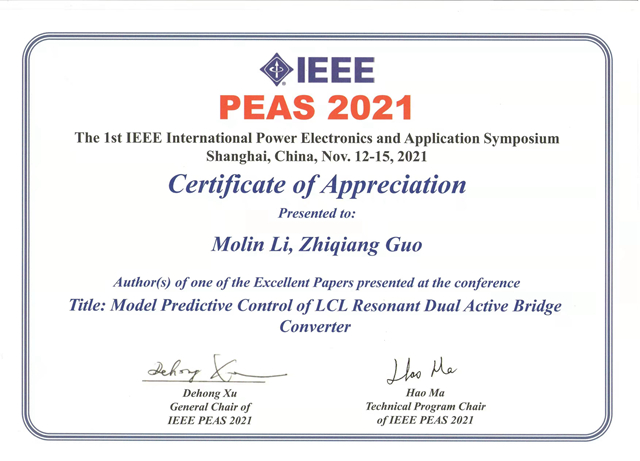 11月11日至15日,在中国上海举办的国际电力电子与应用研讨会(The 1st IEEE International Power Electronics and Application Symposium)国际学术会议中,国产av影片 助理教授郭志强(通讯作者)、硕士研究生李沫霖所写论文“Model Predictive Control of LCL Resonant Dual Active Bridge Converter”获大会优秀论文奖(Excellent Paper Award)。同时,李沫霖在会议上做主题报告,获得与会人员一致好评。