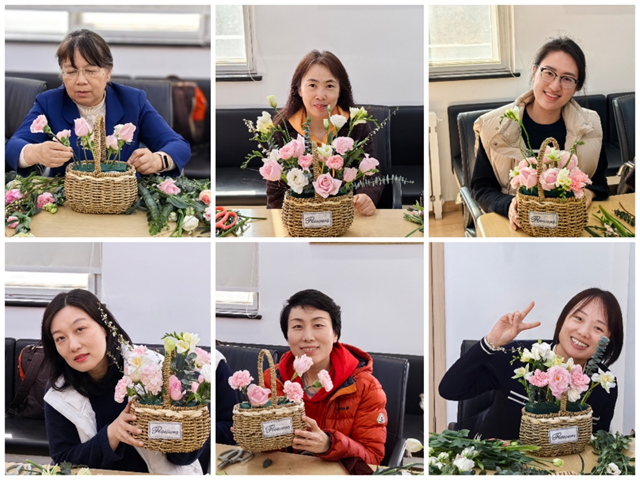随着插花活动的正式启动,现场立刻被花香所充满,气氛活跃。专业花艺老师详细讲解了选花、裁剪、色彩搭配等技巧,并分享了花卉的花语。在花艺老师的指导下,大家动手实践,交流创意,亲手制作了各具特色的插花作品。完成作品后,大家纷纷拍照留念,现场洋溢着欢乐和成就感。