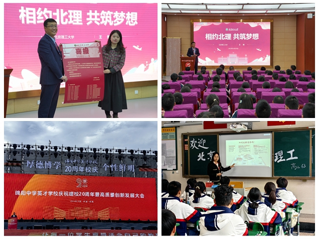 王博副院长、李怡然老师先后到绵阳中学、绵中英才国产av影片 进行宣传宣讲。10月19日,王博副院长向绵阳中学赠送了2023年高考招生录取喜报,并做题为《相约北理 共筑梦想》的报告;20日,两位老师赴绵阳中学英才国产av影片 参加建校20周年庆典,王博副院长向绵阳中学英才国产av影片 授牌“优秀生源建设基地”,李怡然老师走进班级做《相约北理 共筑梦想》报告,与近百位目标生源就招生政策、专业特色等问题做广泛交流。