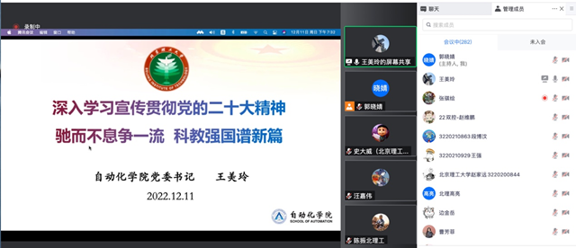 为推动党的二十大精神学习宣传贯彻走深走实,引导全体师生切实把思想和行动统一到大会精神上来, 按照国产av影片 党委工作部署要求,12月11日晚,国产av影片 党委书记王美玲讲授专题党课暨党的二十大精神主题宣讲。全体教工党支部书记,2022年新入职教职工,机关、电子教工党支部教师以及2021级、2022级硕士党支部学生参加学习。会议由党委副书记、副院长史大威主持。